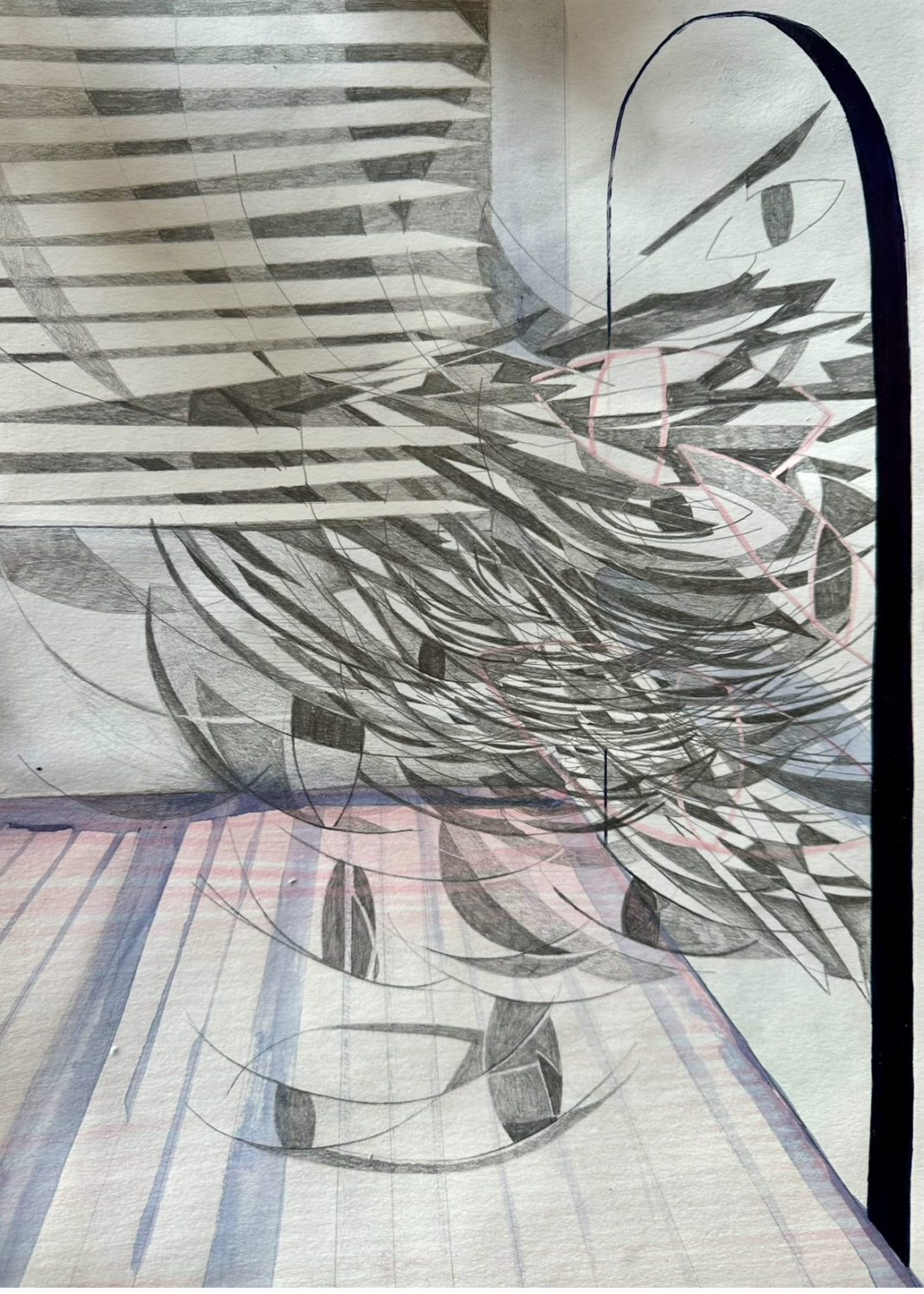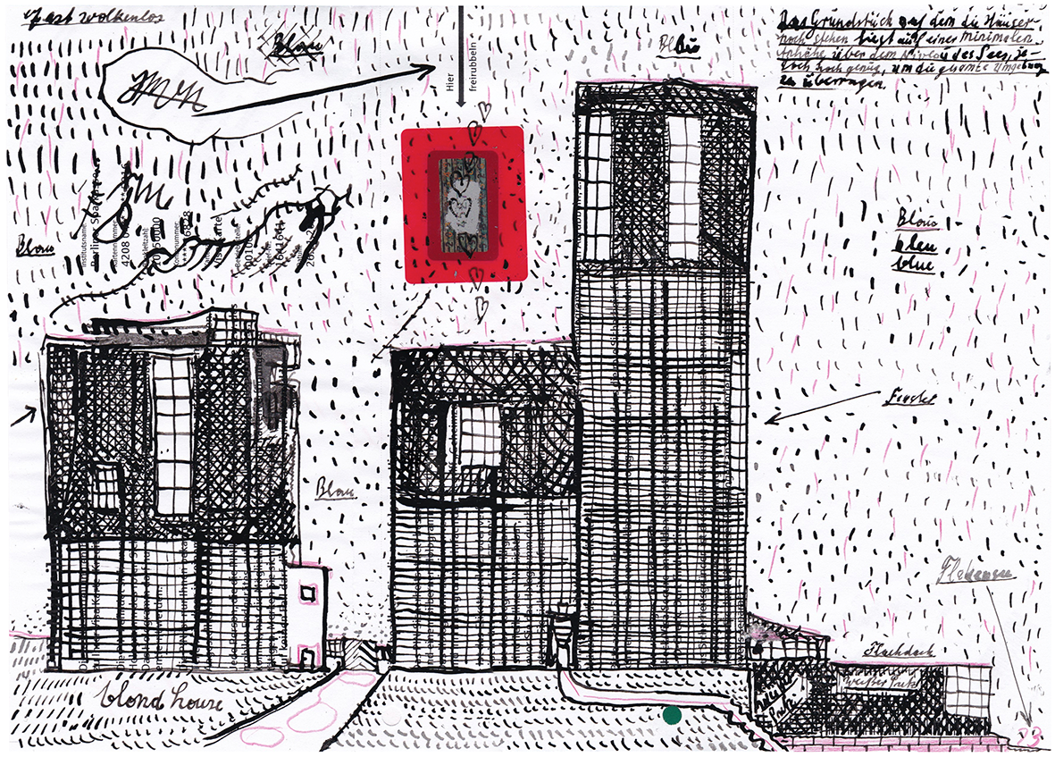 Bleistift, Buntstift und Tusche auf Papier